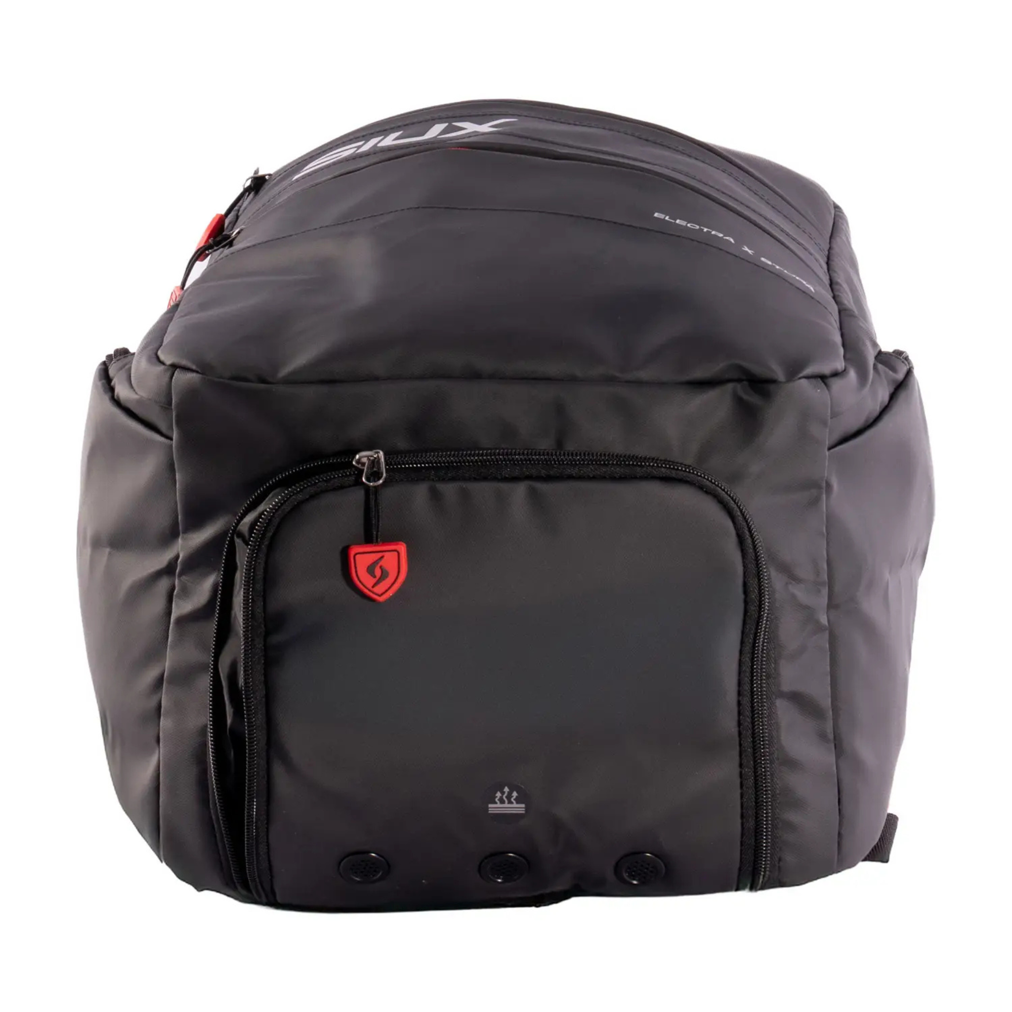 SIUX Backpack Electra Stupa Red 2026 offers 3 compartments with thermal racket protection and ventilated shoe pocket. Franco Stupaczuk signature padel bag. Dimensions 50x32x22cm, ergonomic straps, polyester build. Compact design for competitive players.