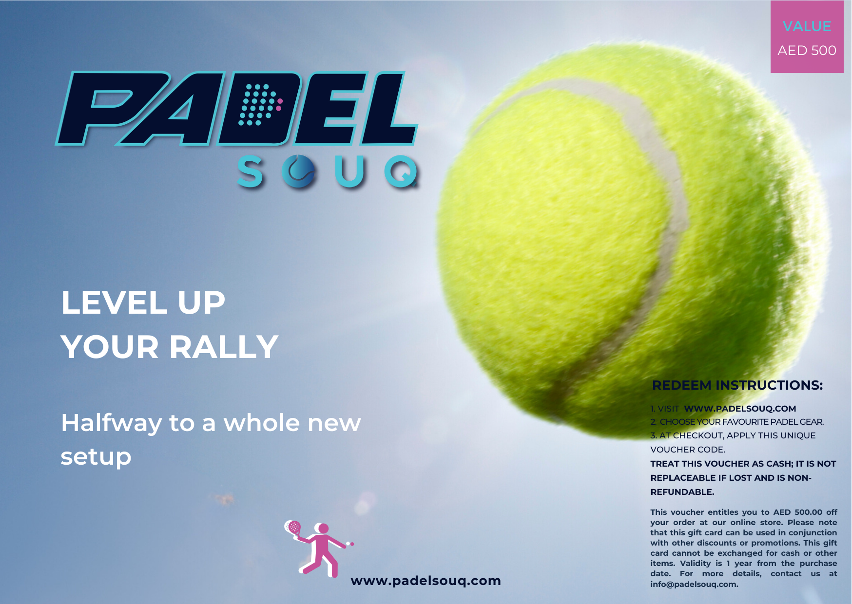 Answer: A digital AED voucher you redeem on padelsouq.com. Choose a value, receive a unique code by email, and apply it at checkout.