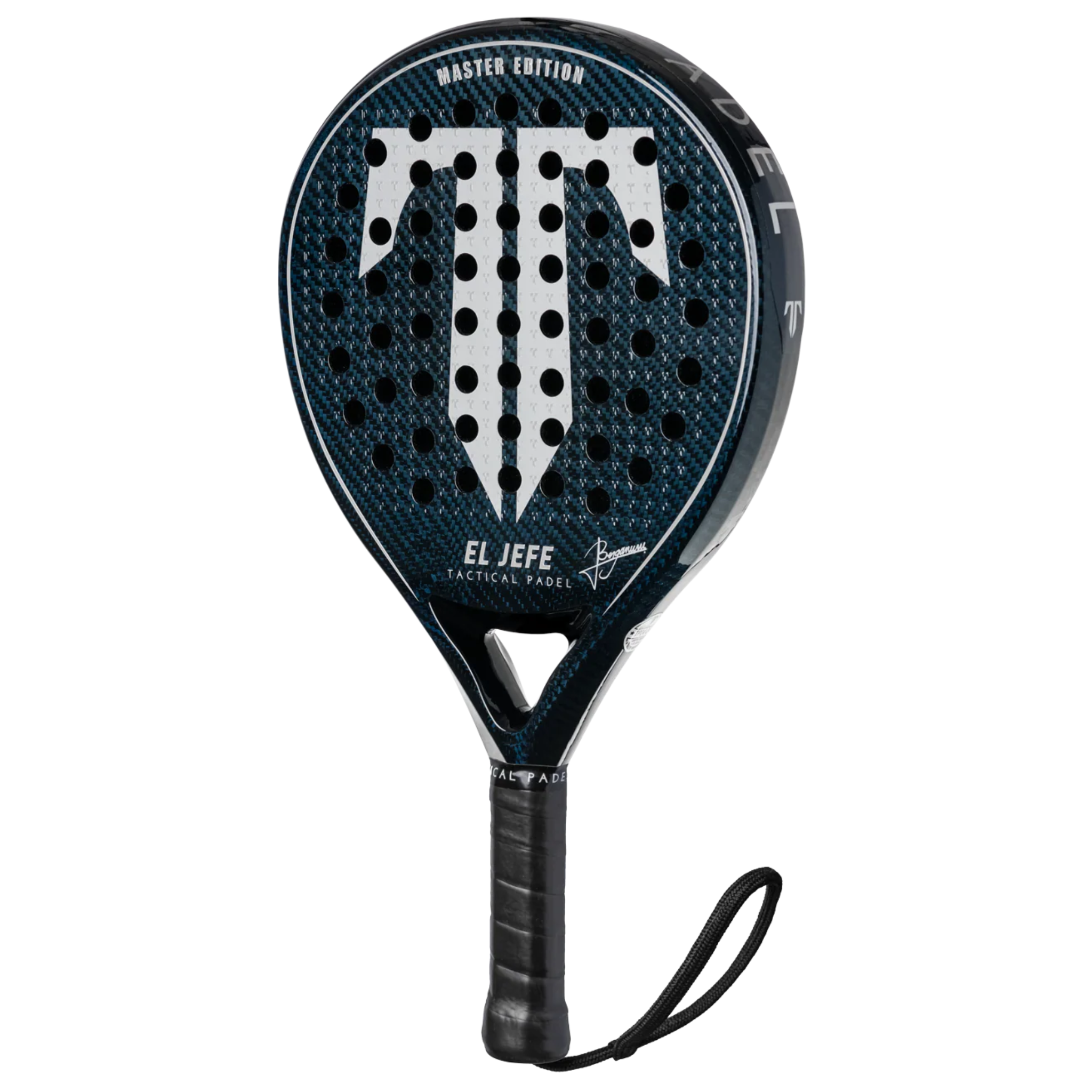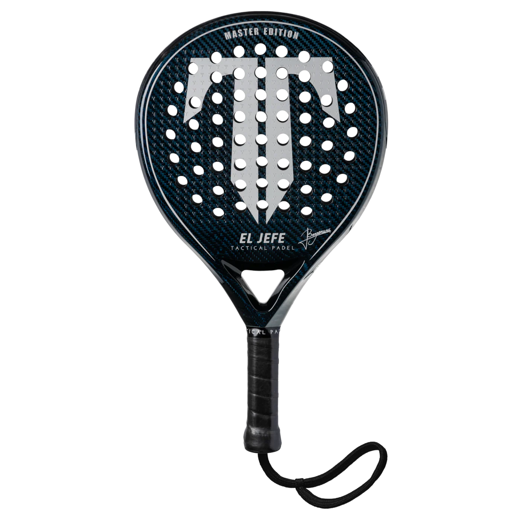 Tactical El Jefe Bergamini Master Padel Racket - Round shape, lightweight 3K carbon fiber, medium-soft core, 355-365g. Features expanded sweet spot, superior control & maneuverability. Handcrafted in Europe with eco-friendly GreenPoxy. Perfect for all levels.