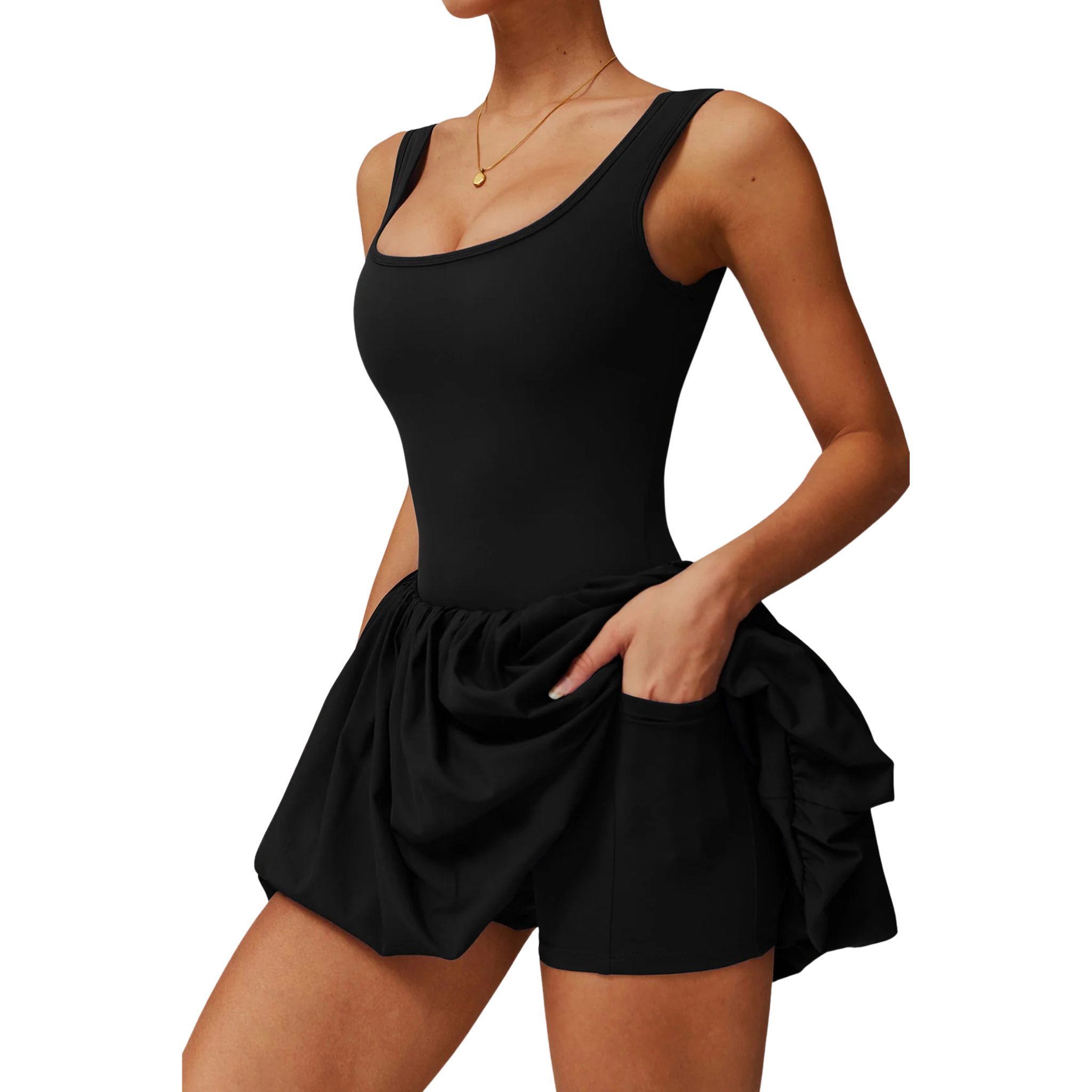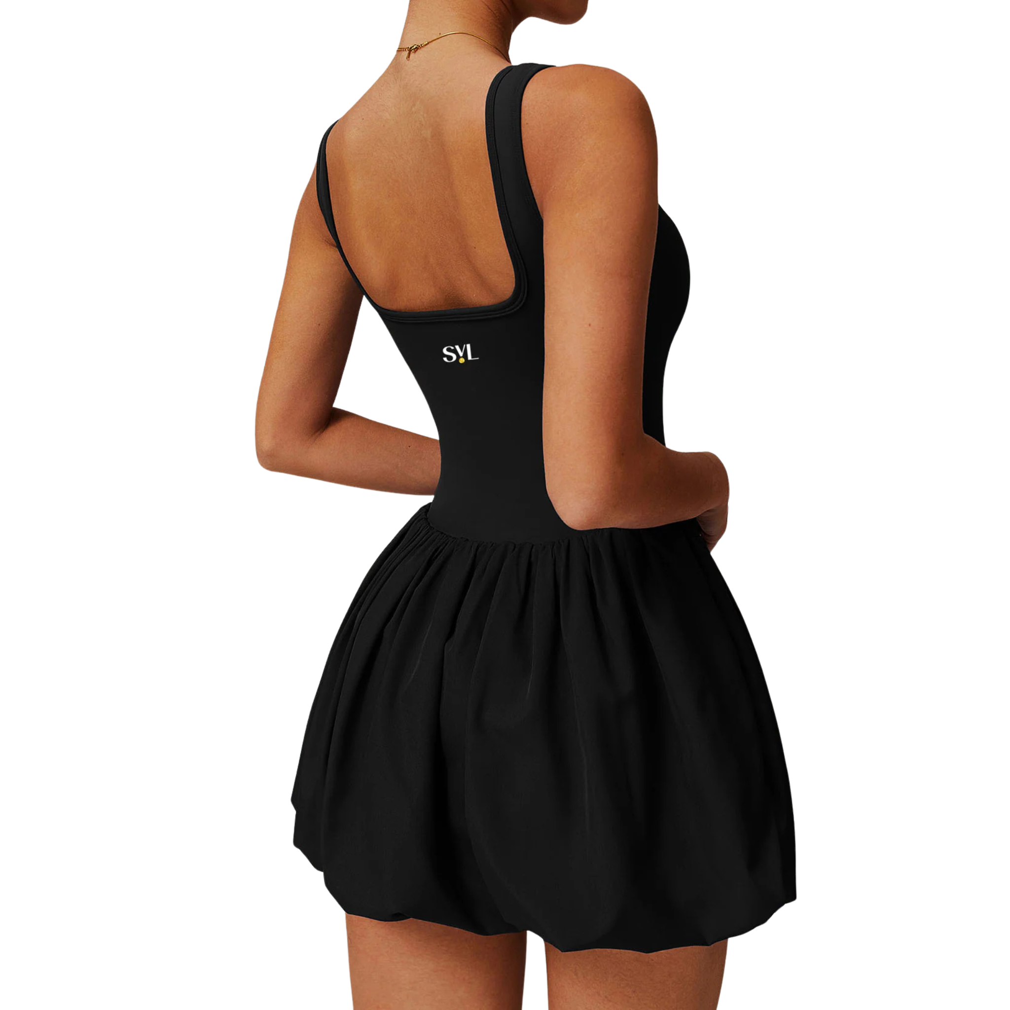 Elevate your style with the SVL Bubble Belle Padel Black Dress! Featuring a sleek bodice with a built-in bra, a playful bubble skirt, built-in shorts, and hidden pockets, it's perfect for padel, casual outings, or chic nights out. Experience comfort, versatility, and standout design.