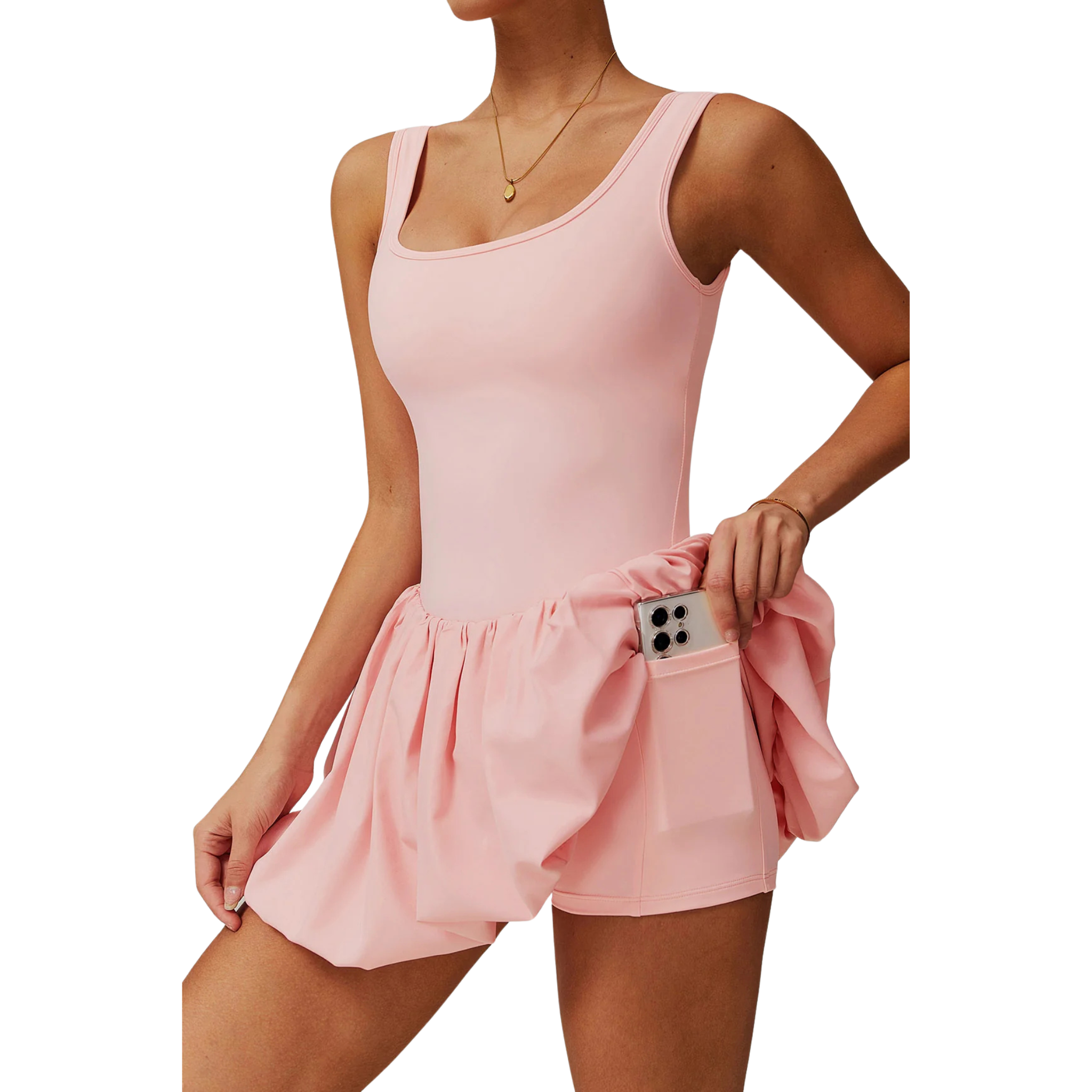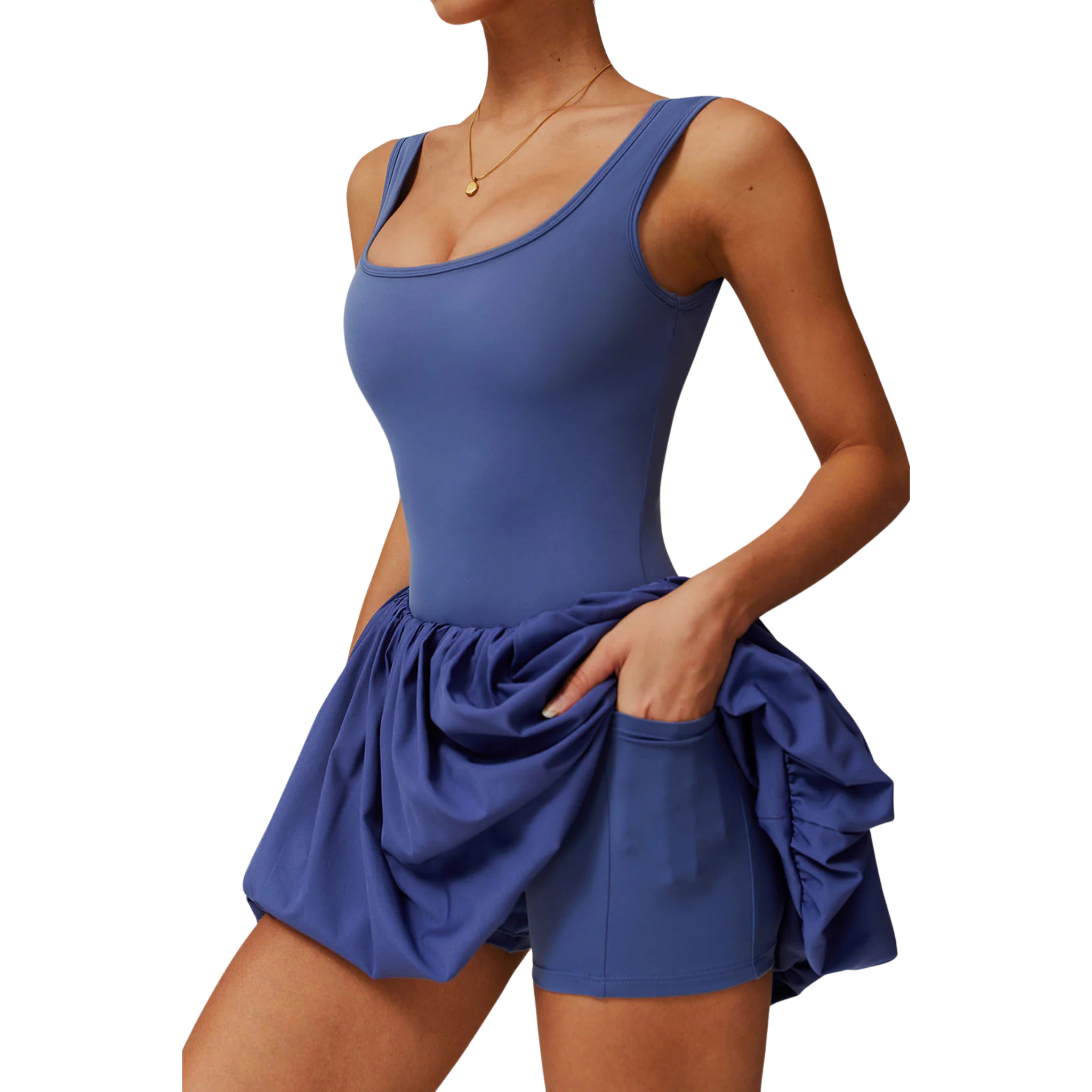 Yes, the dress includes built-in shorts with added pockets for extra coverage and convenience during activities like padel or casual wear.